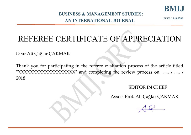 BMIJ Dergisinde makale değerlendirme sürecinde Hakem olarak görev yapan değerli akademisyenlere "HAKEM TEŞEKKÜR BELGESİ" düzenlenmekte ve bu belge değerlendirme sürecini takip eden ilk sayı yayımlandığında e-posta adreslerine gönderilmektedir. Aşağıda Örnek Hakem Teşekkür Belgesini görebilirsiniz.